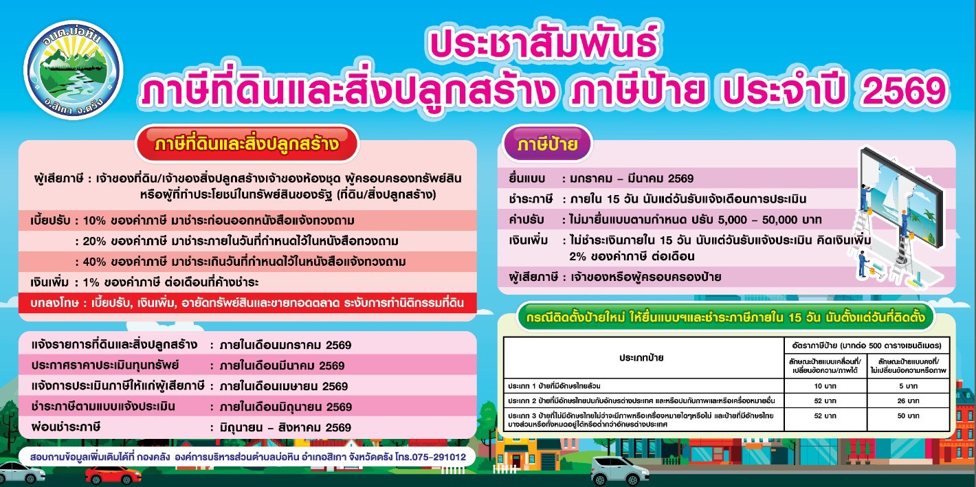 ประกาศองค์การบริหารส่วนตำบลบ่อหิน เรื่อง การขยายกำหนดเวลาดำเนินการตาม พ.ร.บ.ภาษีที่ดินและสิ่งปลูกสร้าง พ.ศ. 2562 ประจำปี พ.ศ.2569